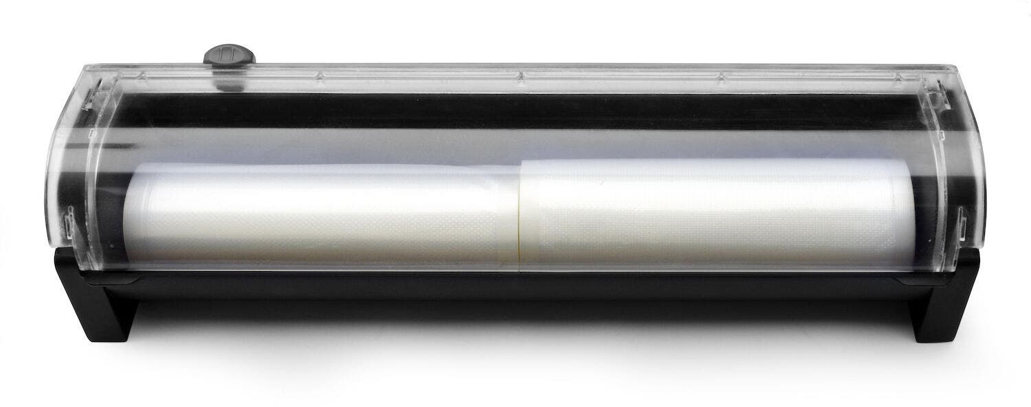 Podložka z ABS Priehľadne polykarbonátové veko pre ľahkú kontrolu stavu rolky Držiak na sáčky v rolke Pohyblivý nôž presne reže sáčok na požadovanú dĺžku Možno pripojiť k baliacemu stroju Kitchen Line 975374 alebo k akémukoľvek inému baliacemu stroju ako samostatný nadstavec Vnútorné rozmery: 412x101x(H)101 mm Rolky s max. rozmermi: ø100×400 mm